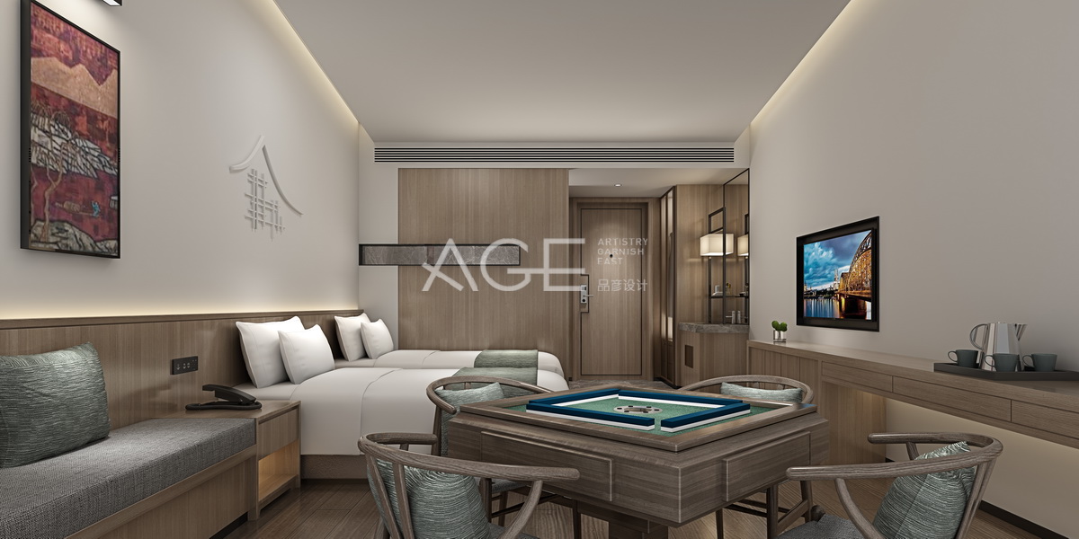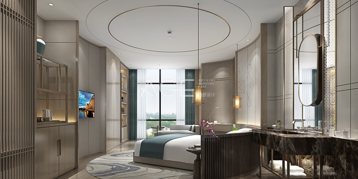 大床房現(xiàn)代與中式結(jié)合的設(shè)計(jì),讓室內(nèi)有了高雅之氣。落地大窗戶,讓空間更顯得明媚亮眼,墻體用線條勾勒出中式元素,再加入現(xiàn)代時(shí)尚的細(xì)節(jié)設(shè)計(jì),完美的結(jié)合出現(xiàn)代中式的氣勢(shì)。天花板和地面上下呼應(yīng)加入圓的設(shè)計(jì),使得大床區(qū)域空間更顯得有立體感。