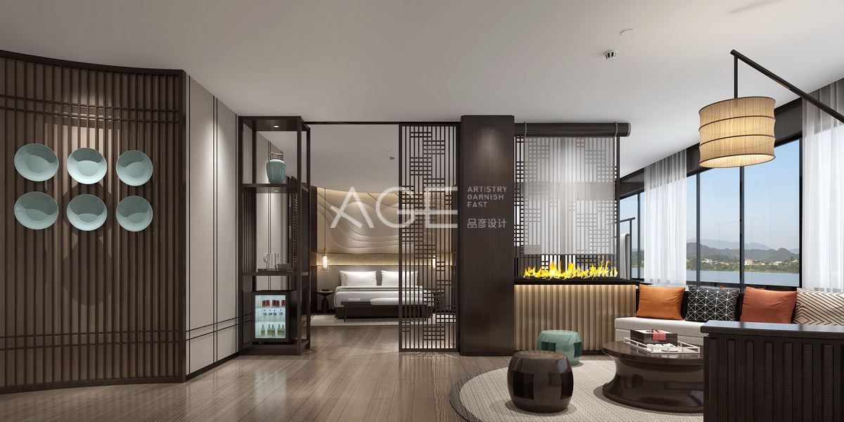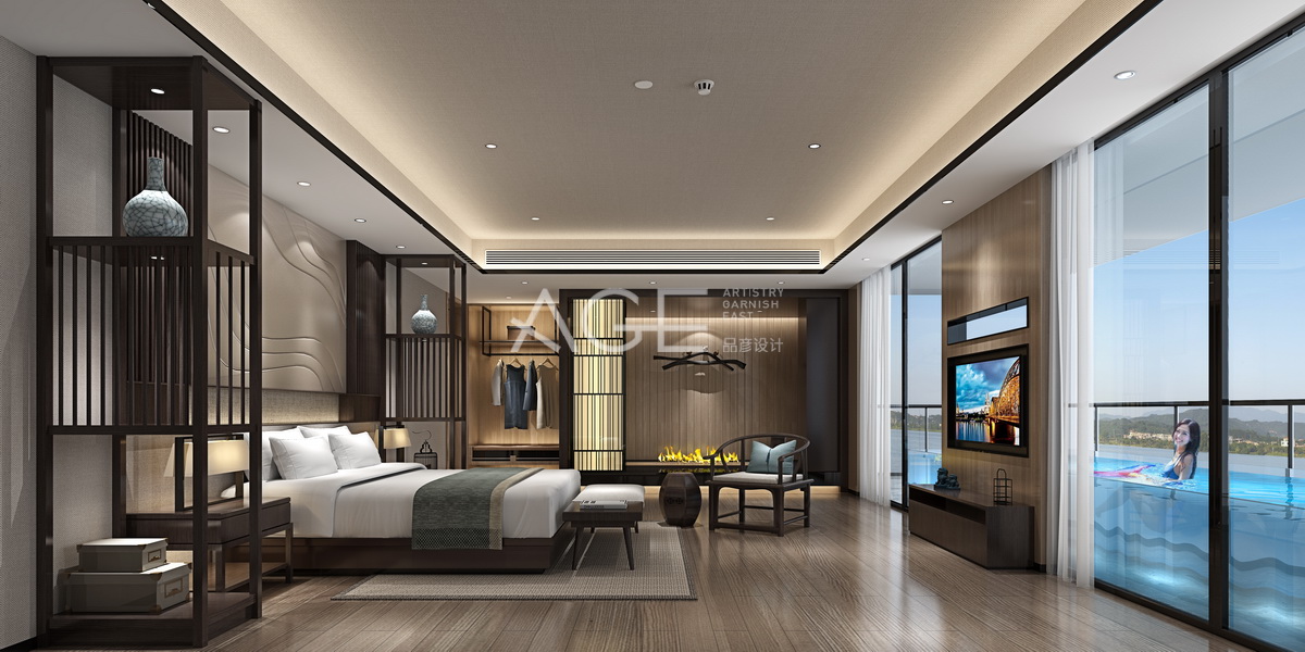 酒店特色房整體設(shè)計(jì)現(xiàn)代中式尤為突出,床頭后背景墻設(shè)計(jì)的中式風(fēng)格,與床區(qū)域兩側(cè)落地木雕柜設(shè)計(jì)相得益彰,木質(zhì)地板與天花板方形設(shè)計(jì)呈現(xiàn)相呼應(yīng)的氣勢(shì),中式座椅讓整體空間更顯得古韻氣場(chǎng),與大床相對(duì)應(yīng)的墻體設(shè)計(jì)只有一小塊用了實(shí)體,兩側(cè)則是落地大窗,左右推開可以去釣魚或者一展游泳的風(fēng)采,從里到外的整體空間顯得實(shí)用優(yōu)雅而自然。