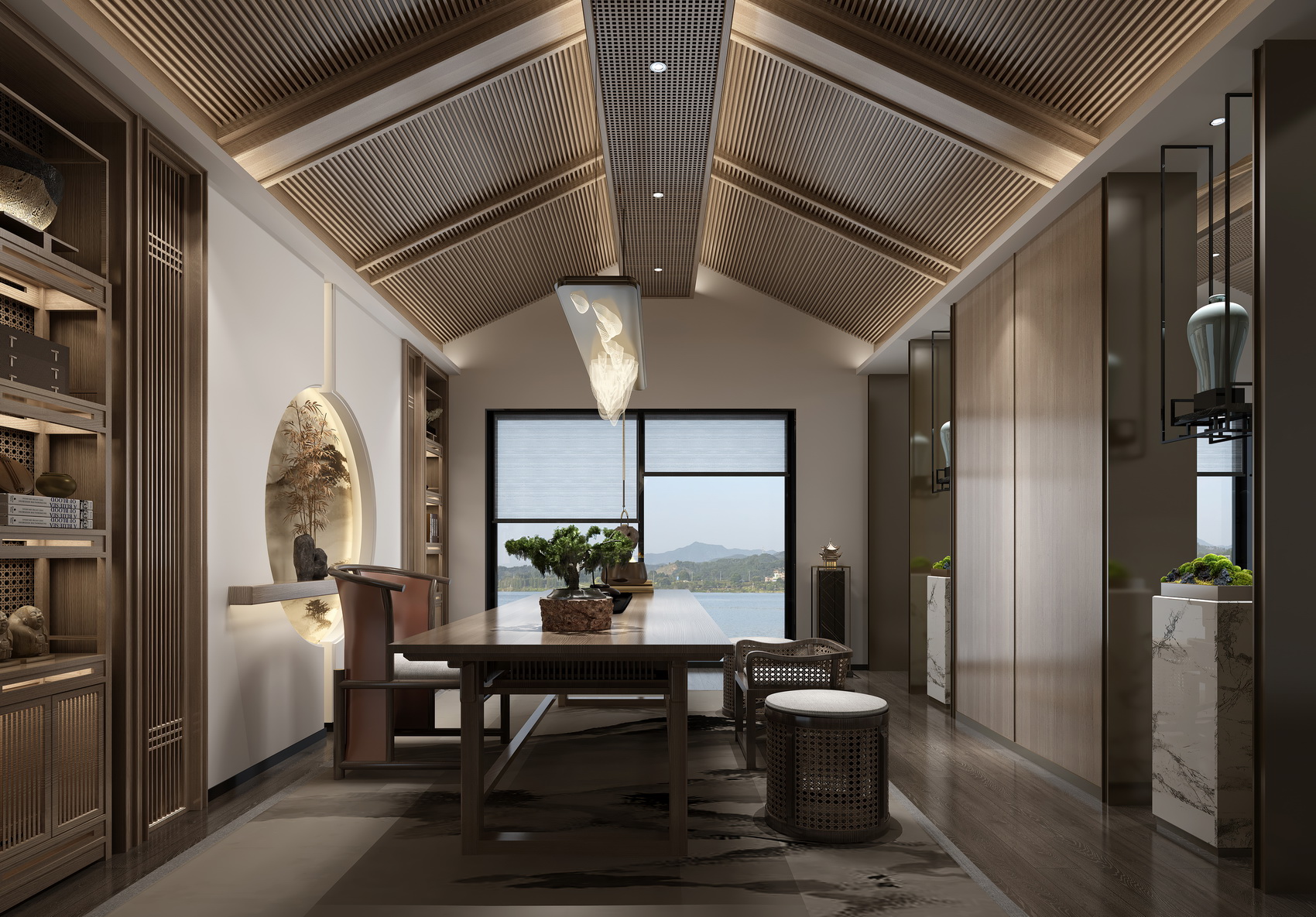 品茶區整體塑造以中式傳統元素為主,整屋選擇同色調木質家具,用深胡桃木色渲染寧靜致遠氛圍。吊頂設計采用類木質建材打造檁條、斜大梁、主橫梁,一同構建古色古香的中式傳統坡屋頂。細節處,設計師采用嵌入半開放式木柜讓墻面空間得以平整呈現,彰顯整潔大氣。主位墻面裝飾采用意味極深的方圓,圓形內凹以水墨山水為背景,結合立體山石直竹,勾勒一幅頗具道家玄妙韻味畫面。不僅于此,屋內裝飾擺件還采用勁松綠植、山水倒掛燈飾、微縮亭臺等等,共同營造一個充滿古韻意味的品茶區。
