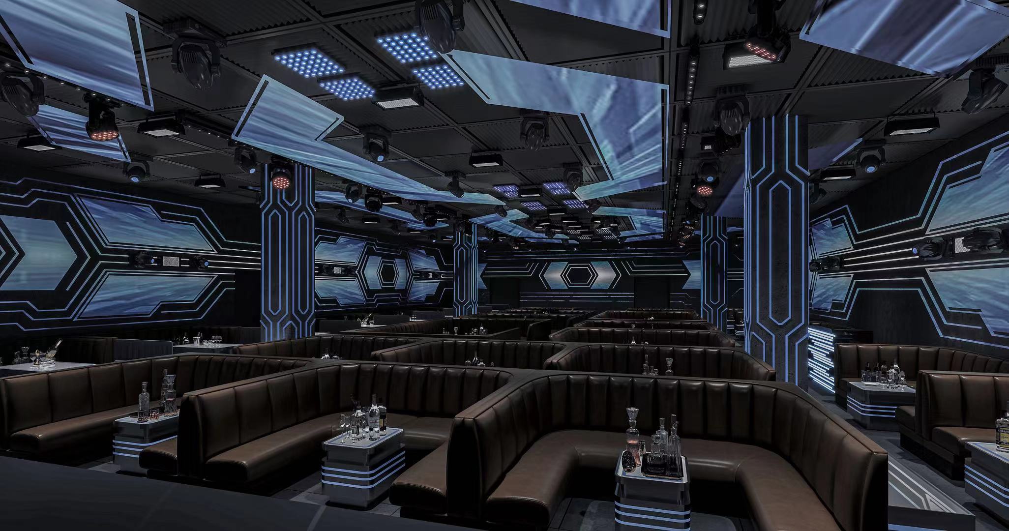 統(tǒng)一的暗色調(diào)皮質(zhì)柔軟沙發(fā)配合上擁有天然花紋的大理石桌面,兩者一同筑建了低調(diào)大氣的大廳氛圍。同時大廳四周墻壁、吊頂、方柱之上齊整分布的光幕和光紋,共同營造了一個充滿速度科幻感的穿越夢幻空間,讓消費(fèi)者仿佛身處異空間,可以暫時拋開現(xiàn)實(shí)生活中的種種煩惱。而桌面上采用蘊(yùn)藏酒吧文化的黑桃燈飾小擺件也顯露出了設(shè)計(jì)師細(xì)膩的搭配功底。